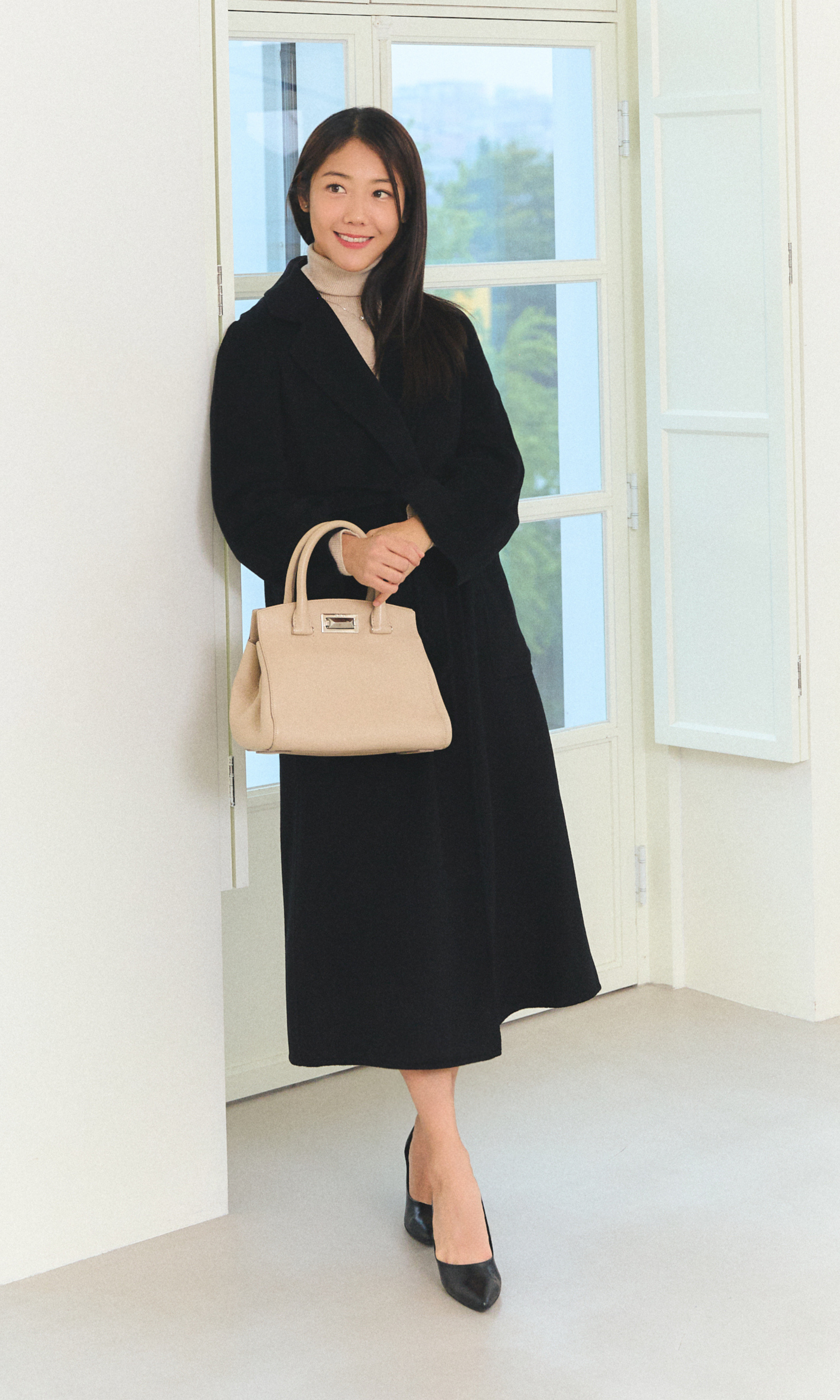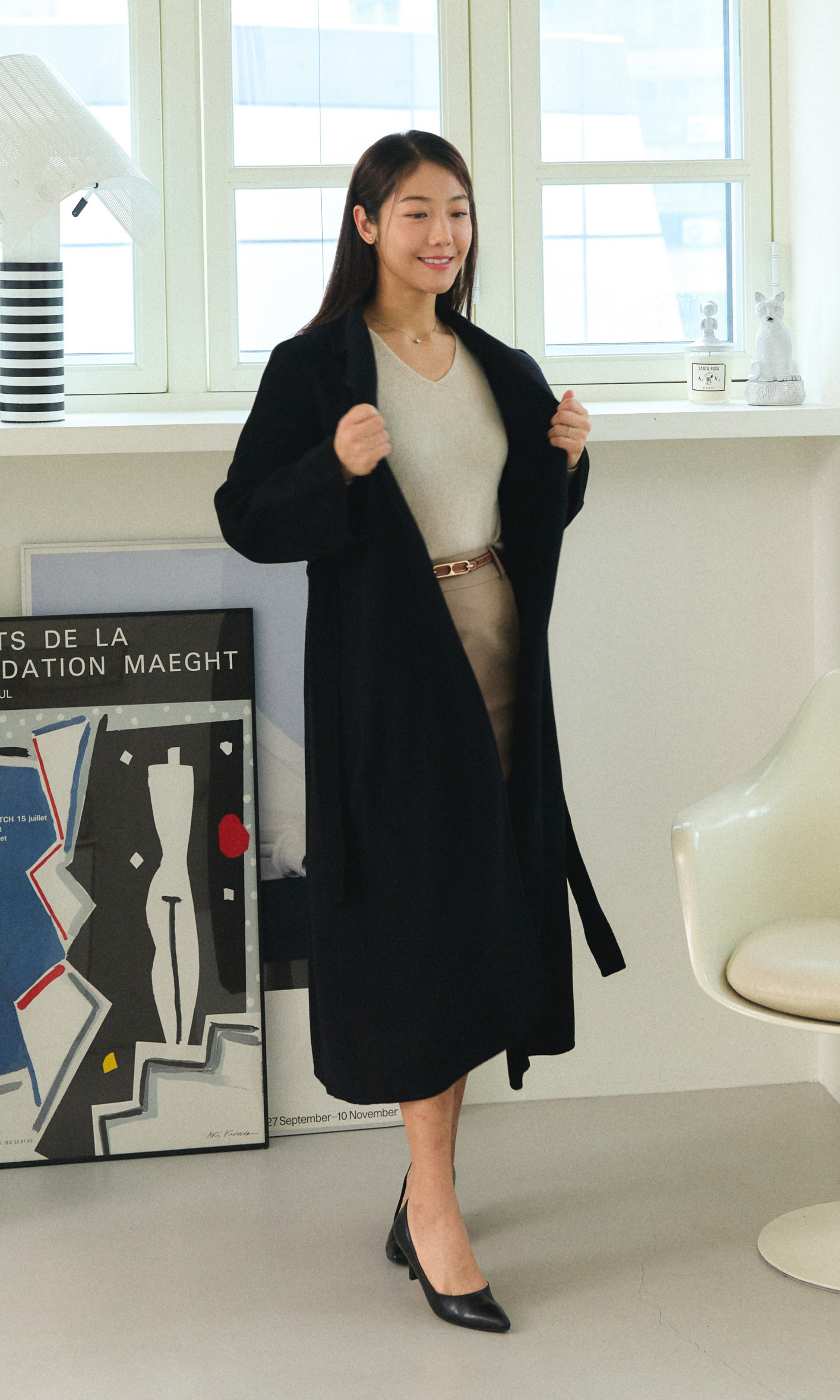 Ashberry’s bestselling winter coat, crafted with 75% premium cashmere and 25% virgin wool woven in-house. It’s incredibly warm yet surprisingly lightweight, with a rich color that shifts subtly in the light. The double-face construction gives the fabric a dense, crisp hand feel and a structure that holds its shape without collapsing. Two tightly woven layers are bonded together, creating a coat that’s light to wear while retaining exceptional warmth.