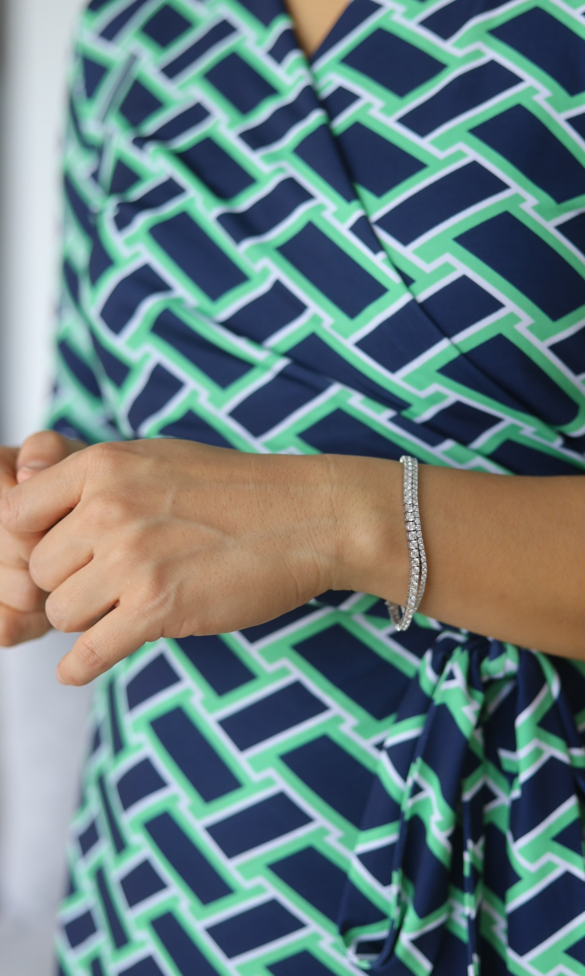 A wrap dress that turns heads with its bold chain-link pattern in vibrant blue and green. The design combines sharp geometry with playful energy, making it a piece that feels confident and fresh. Structured enough for the office yet lively enough for after-work plans, it brings personality without losing polish.