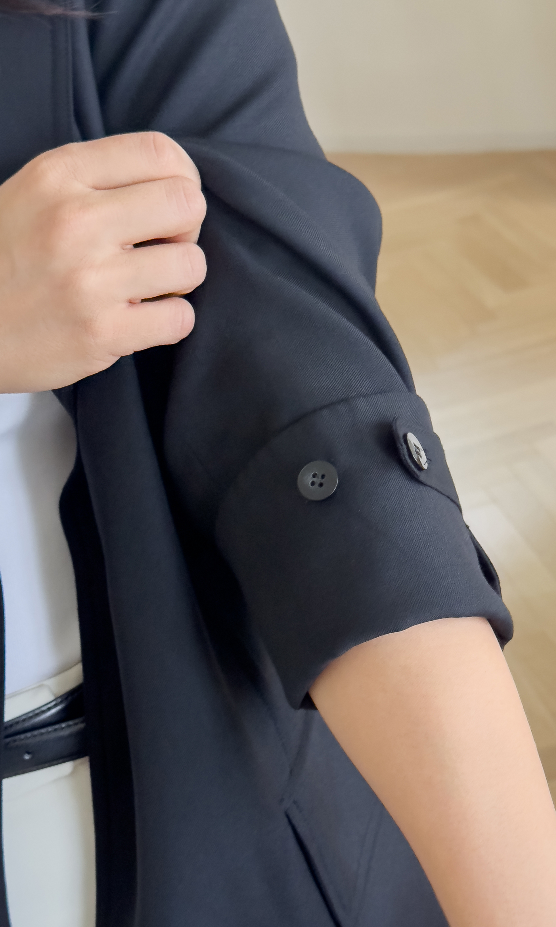 - Natural horn buttons and exterior stitch detailing for subtle refinement